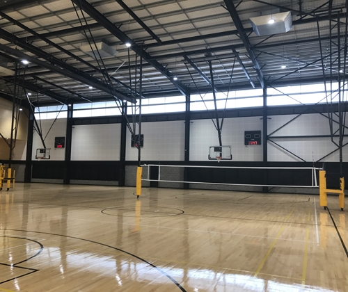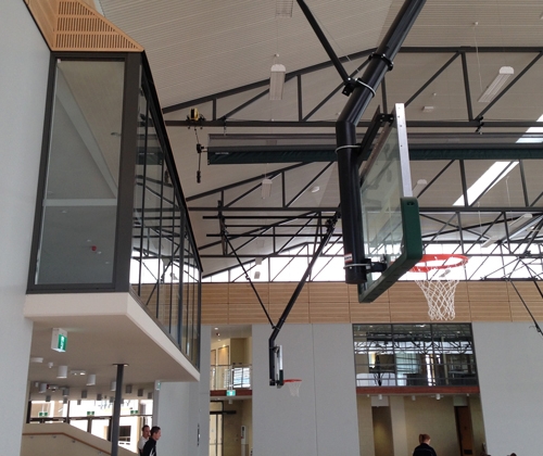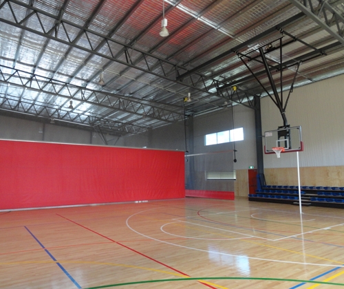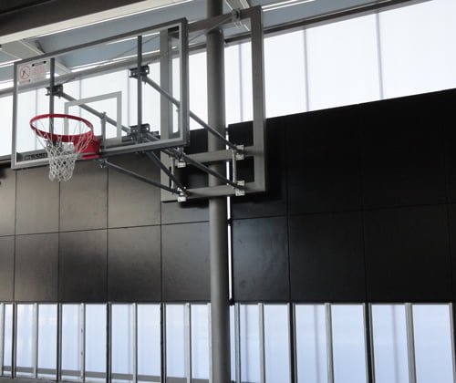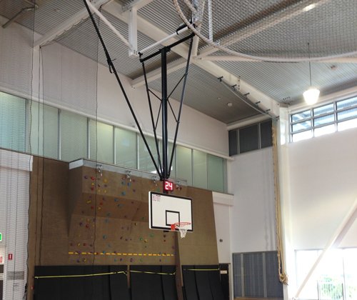 - Optional height-adjustable basketball backboards for flexibility between senior and junior play, with a key-operated electric drive option for automatic height adjustment