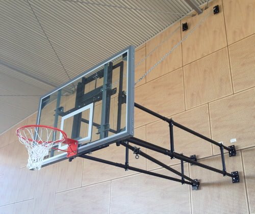 - Six connection points to the wall for systems up to 3.6m, ensuring stability and minimal backboard vibration during play. For projections over 3.6m, the system features eight attachment points, meeting FIBA Level 2 standards
