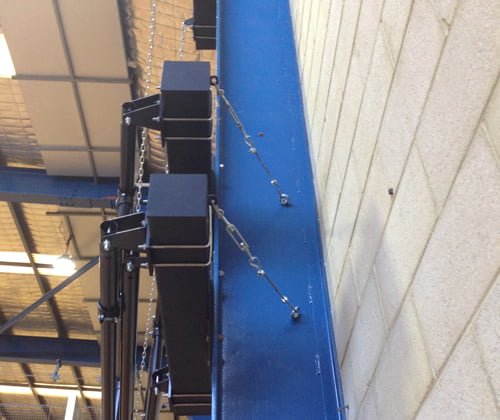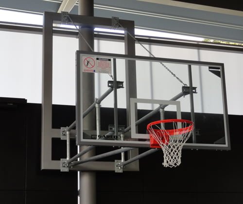 - Maximum stability – six attachment points eliminate bounce and shake commonly seen in four-point systems. For projections over 3.6m, the system uses eight attachment points and reinforced steel bracing for added rigidity and minimal backboard reverberation.